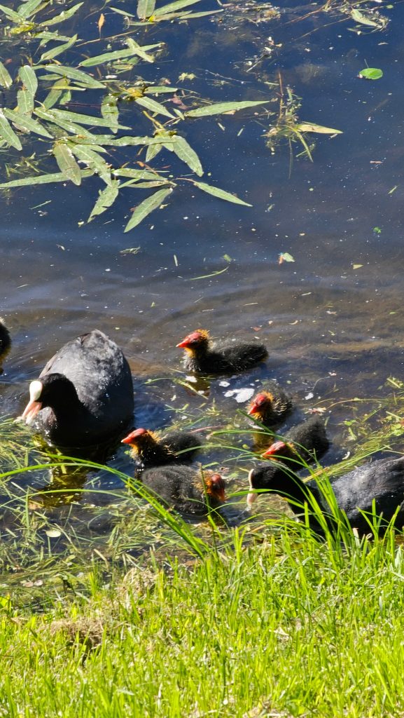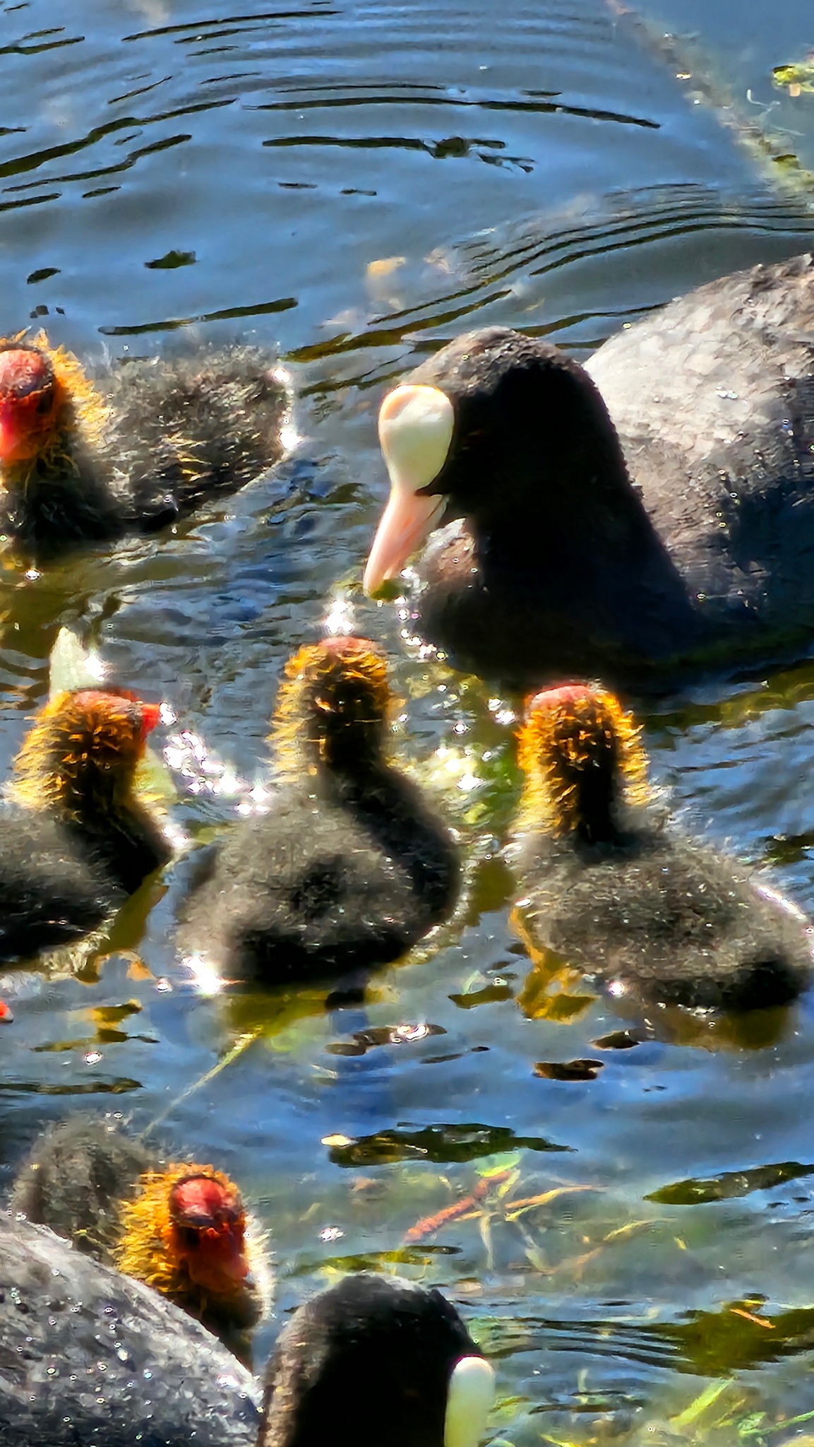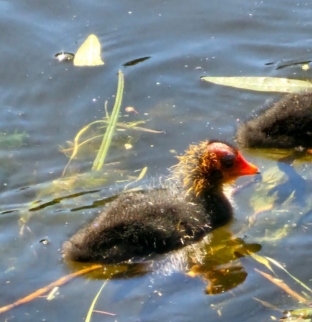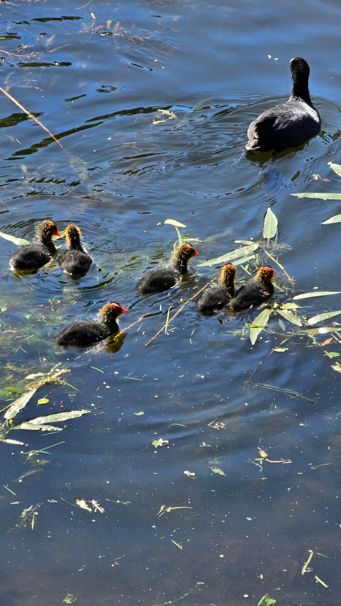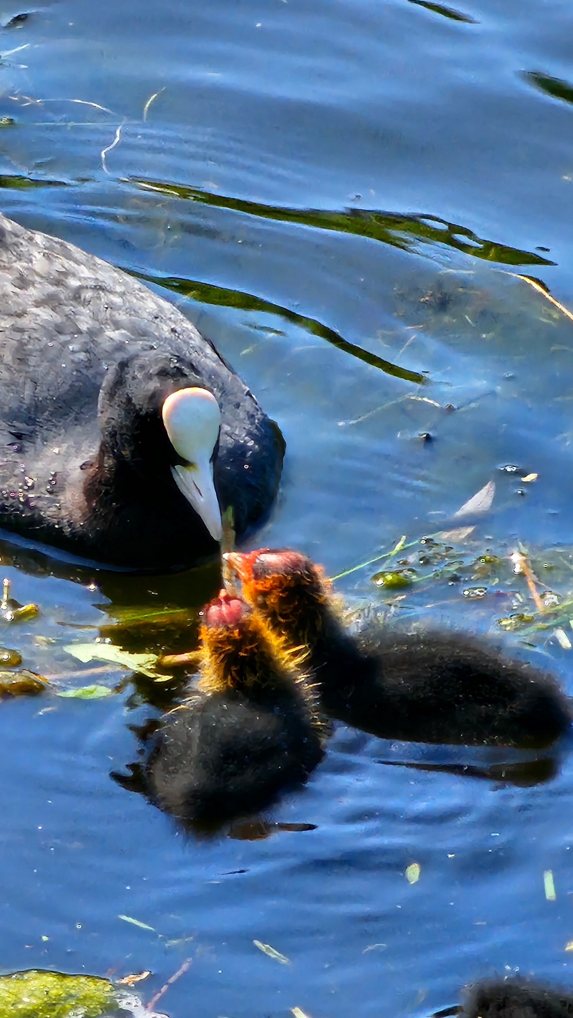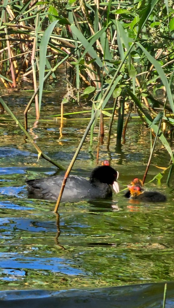 Раньше на пруду были только утки. Но недавно появилась и лысуха. Сегодня мы снова увидели лысух, и уже со смешными птенцами.