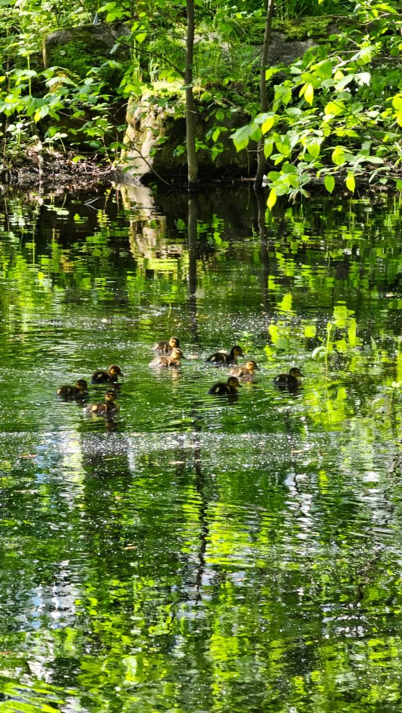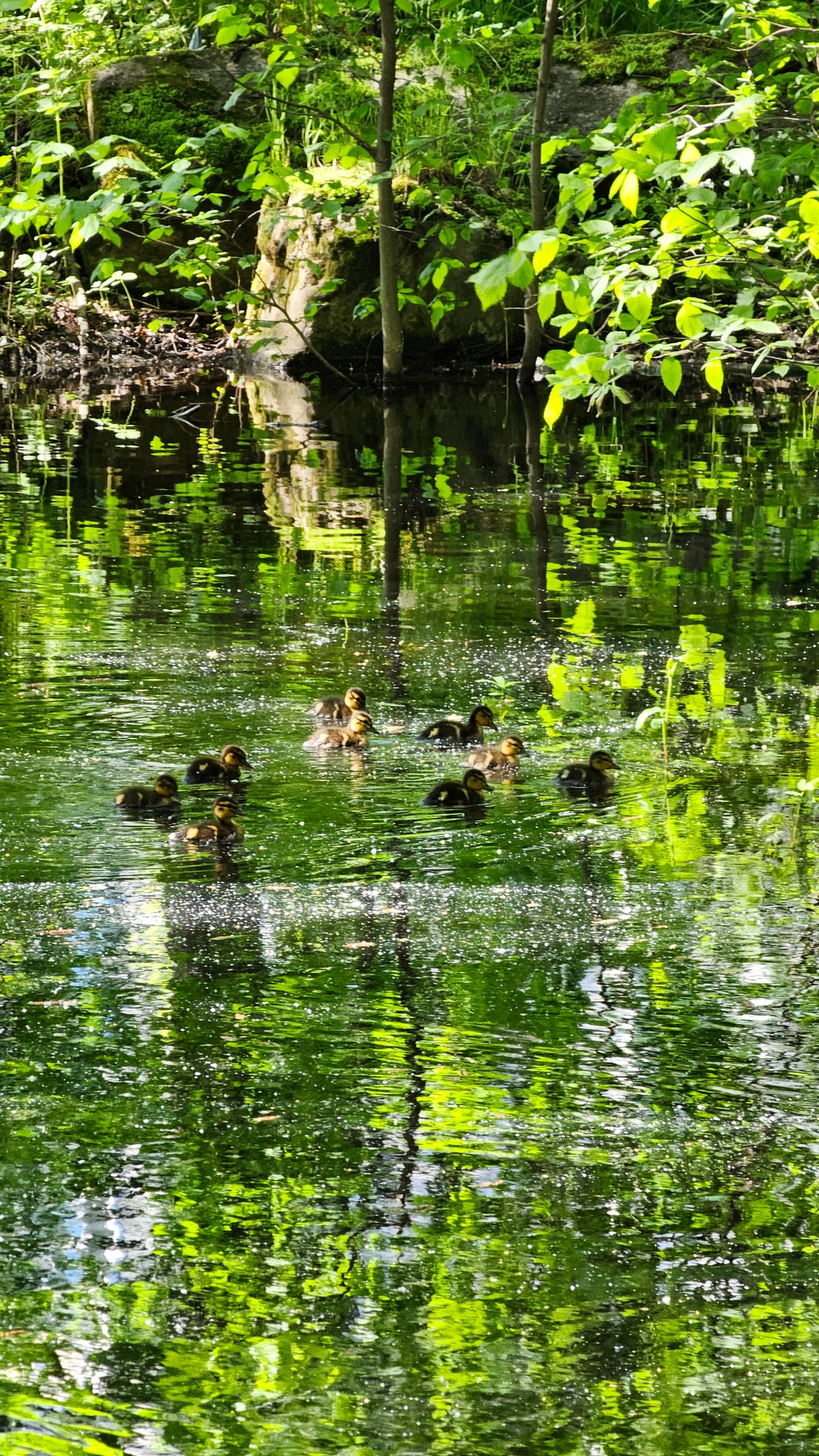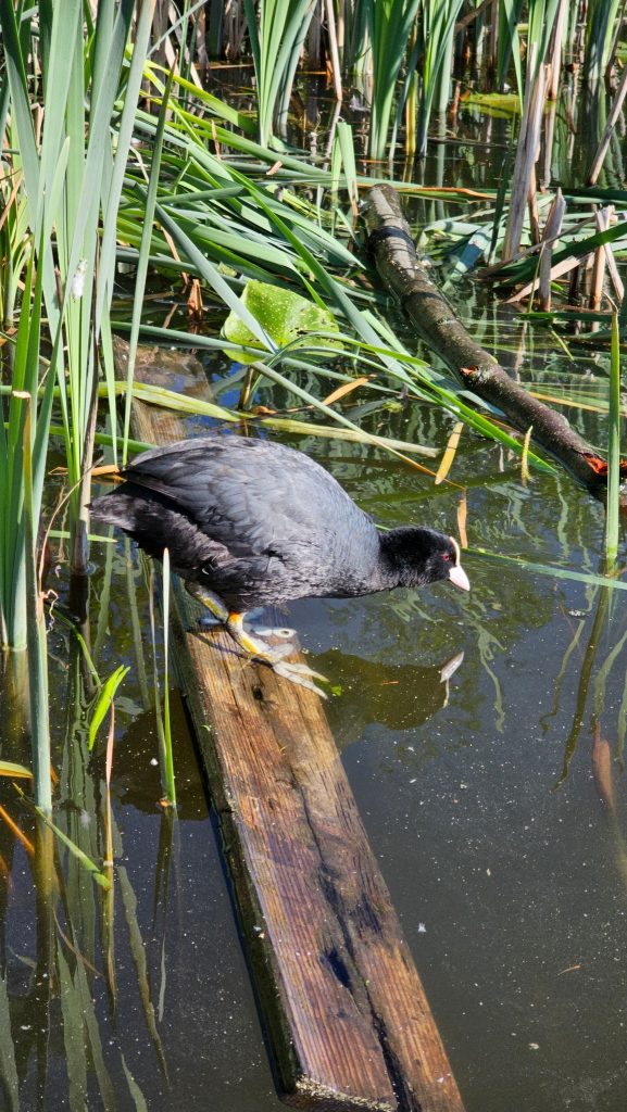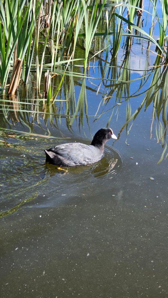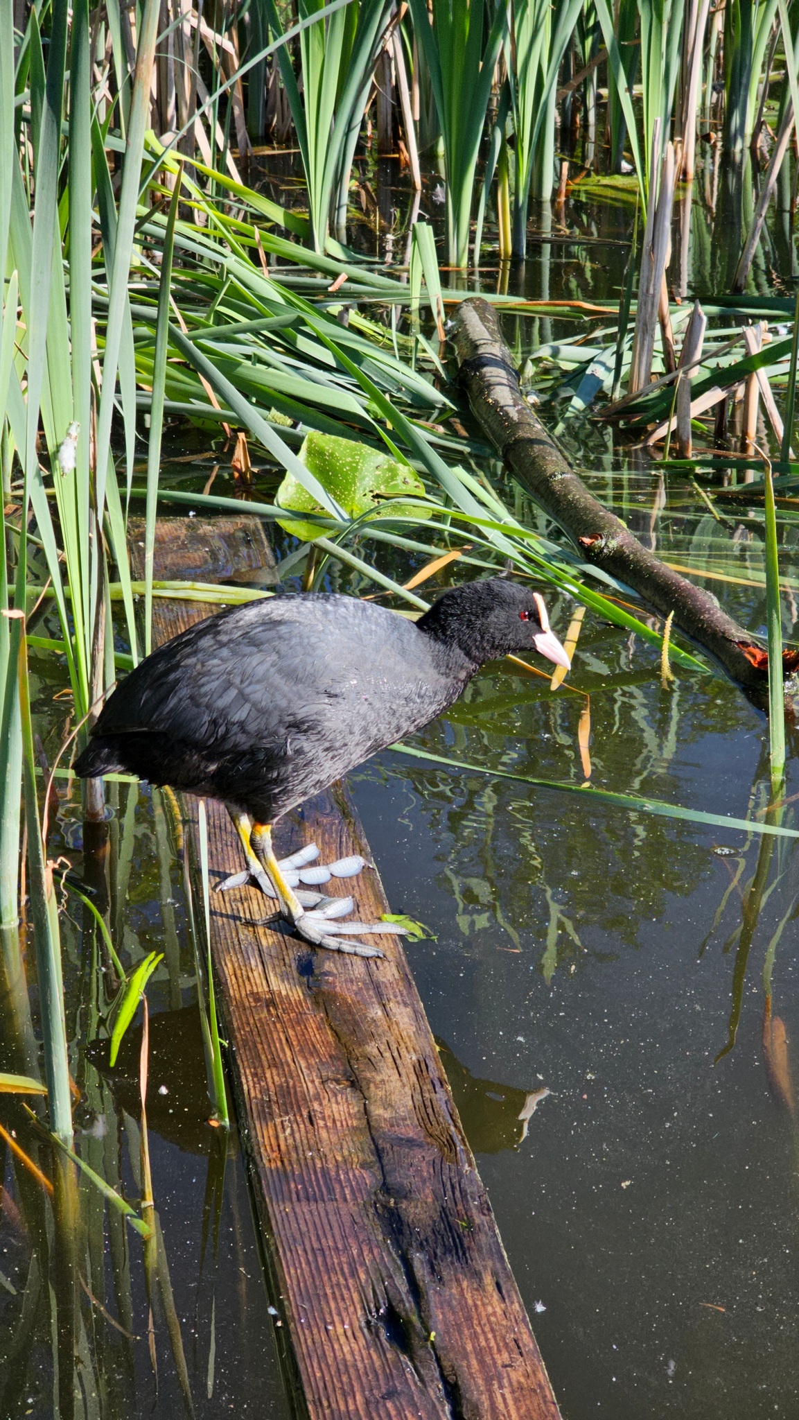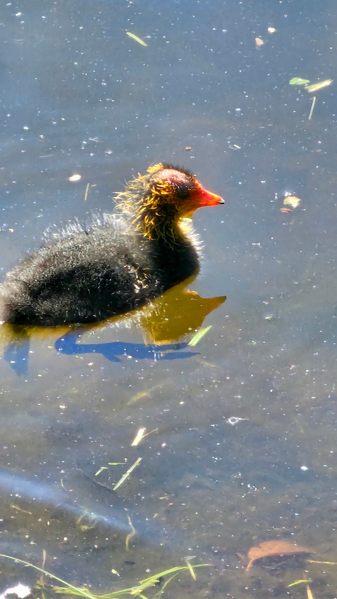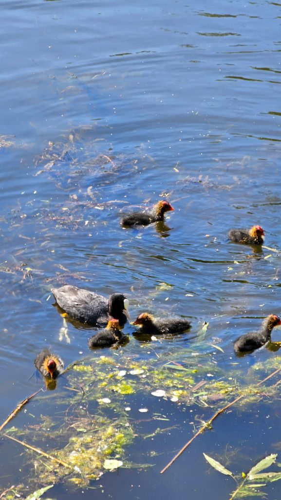 Раньше на пруду были только утки. Но недавно появилась и лысуха. Сегодня мы снова увидели лысух, и уже со смешными птенцами.
