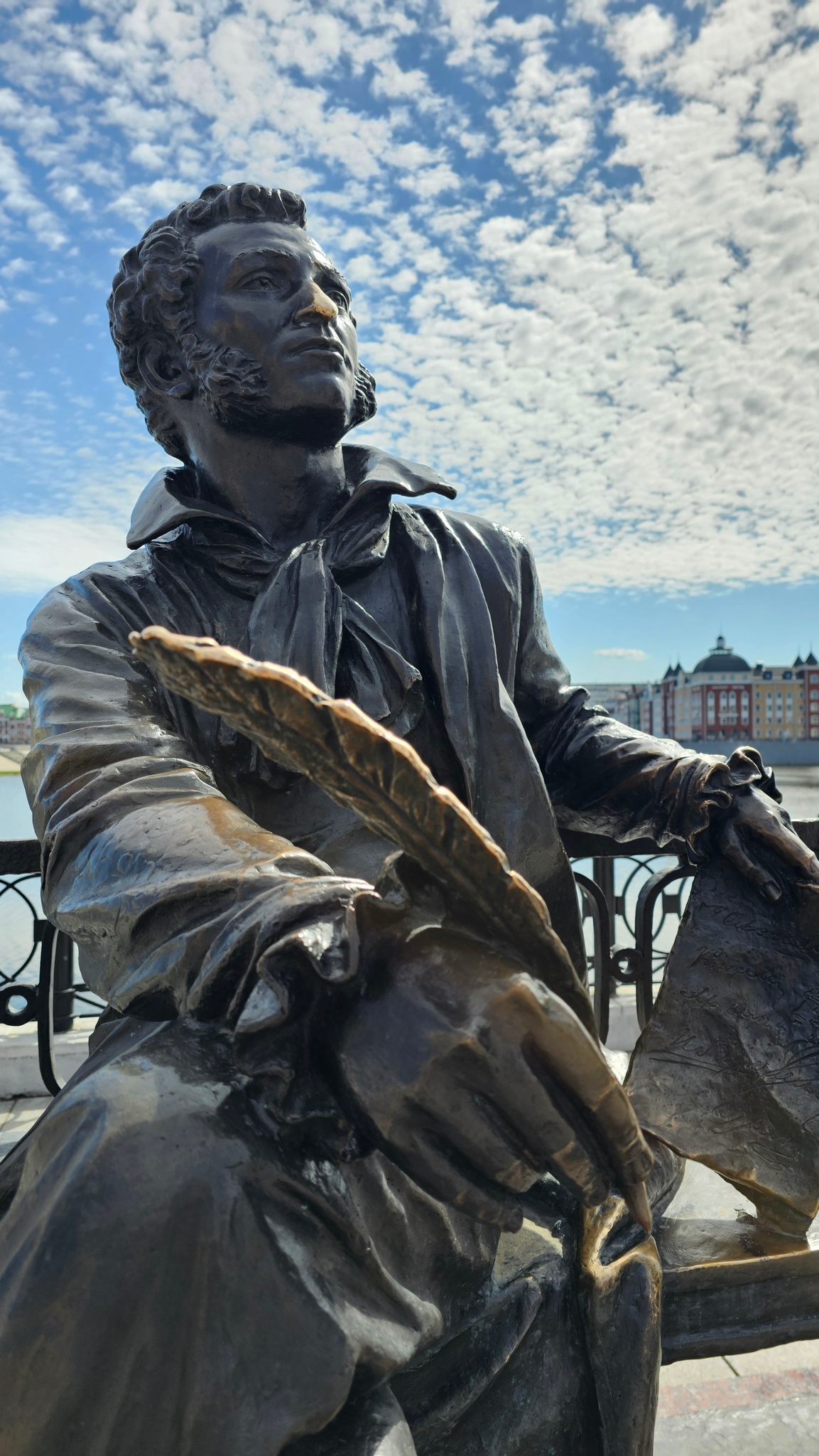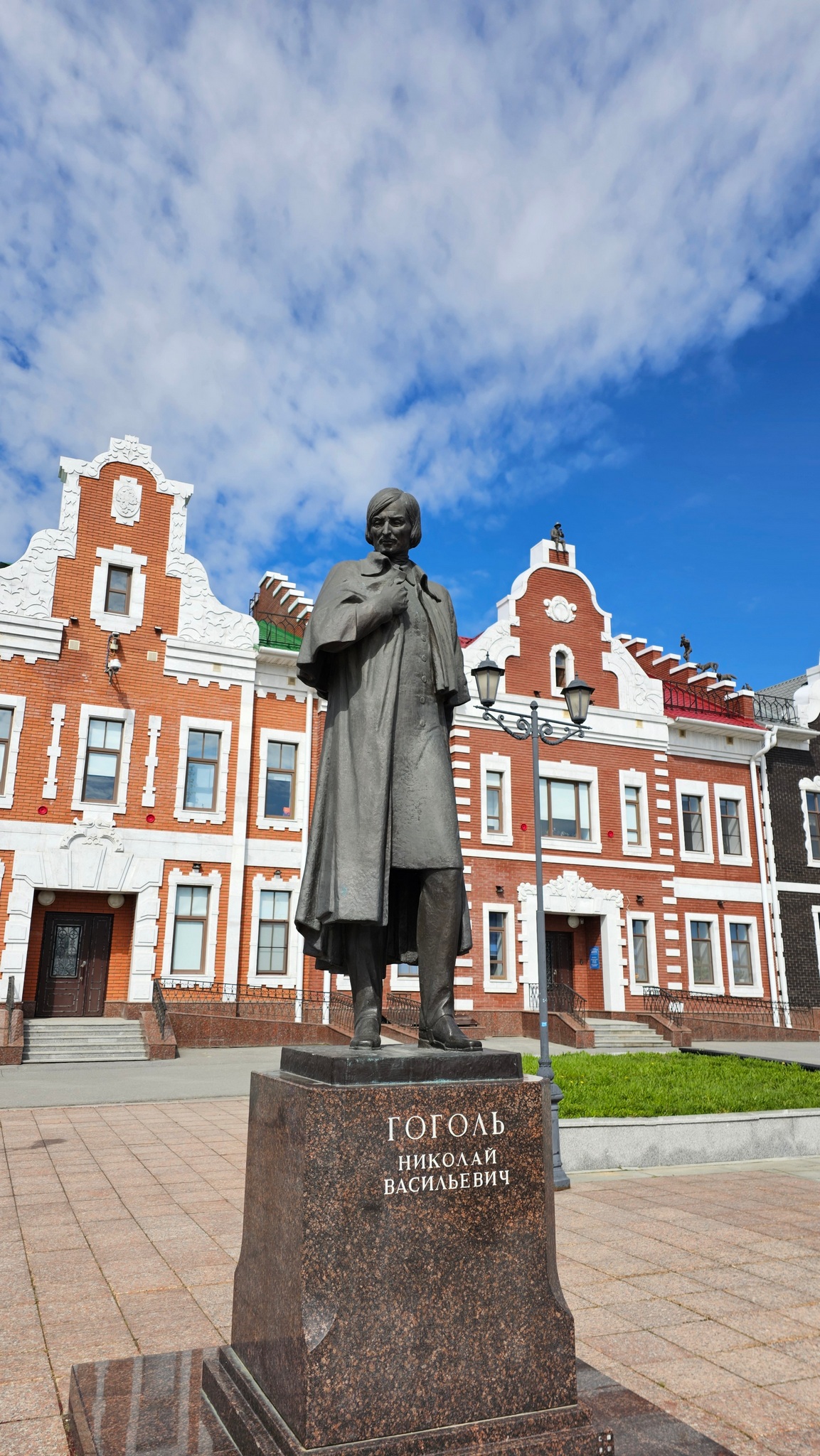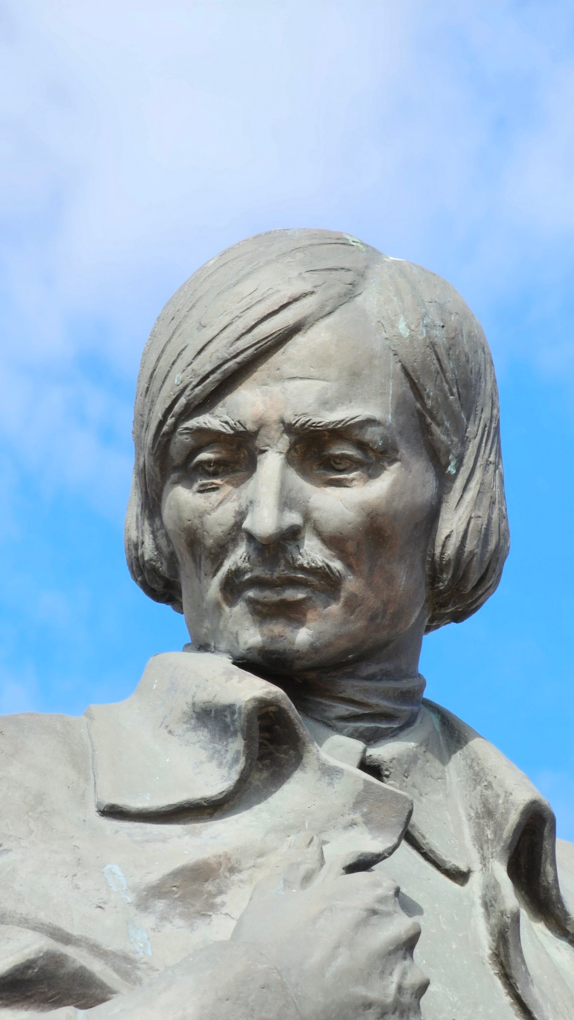 Вот и подходим к концу набережной Амстердам. На площади у моста — памятник Гоголю. Гоголь очень грустный и задумчивый.