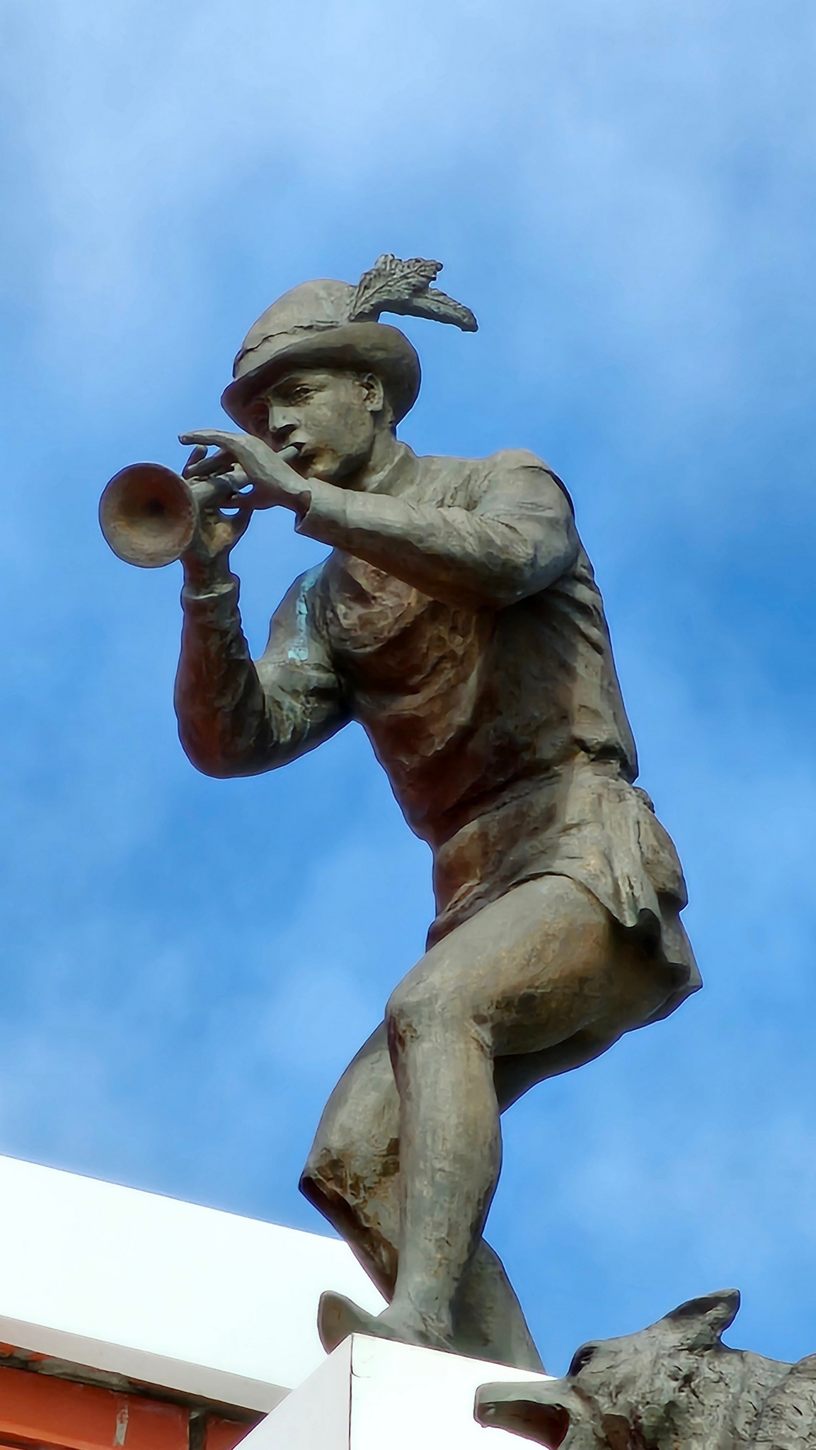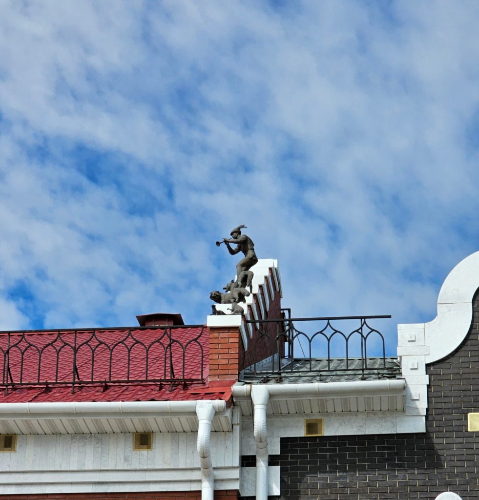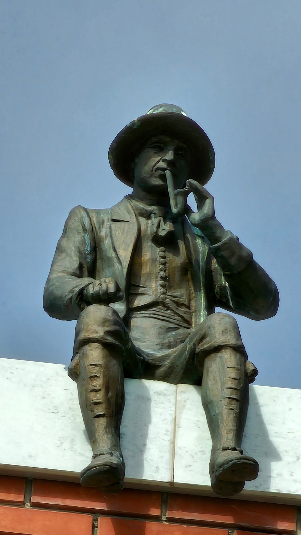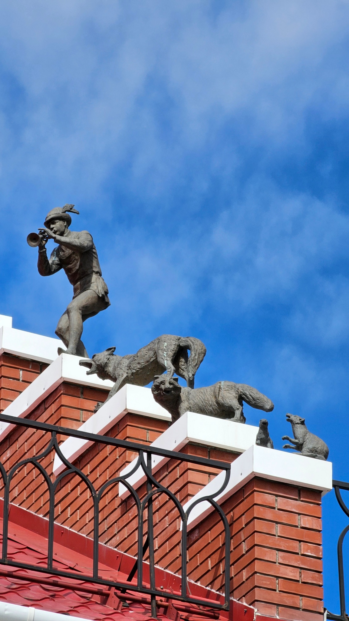 И еще наверх поглядим. Там на крыше некий дудочник с волком, лисой и двумя крысами. Чуть дальше сидит дядька и спокойно курит трубку. На карте обозначена сия группа — Гамельнский крысолов.