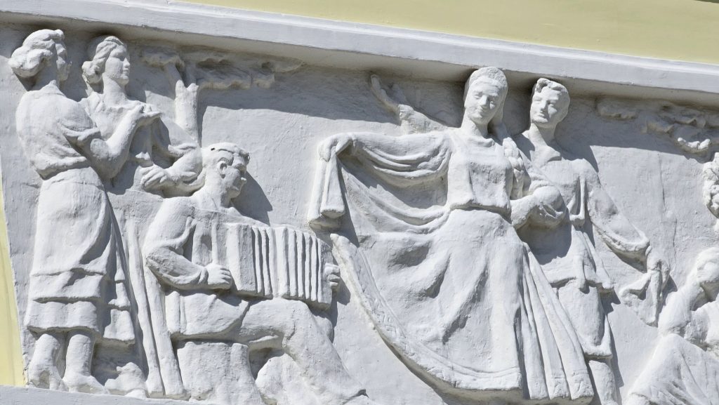 Они окружают дерево, представляющее собой символ жизни и мира. Подобное древо часто становилось элементом орнаментов марийской вышивки.В скульптуре отражены многие элементы традиций и искусства марийского народа.