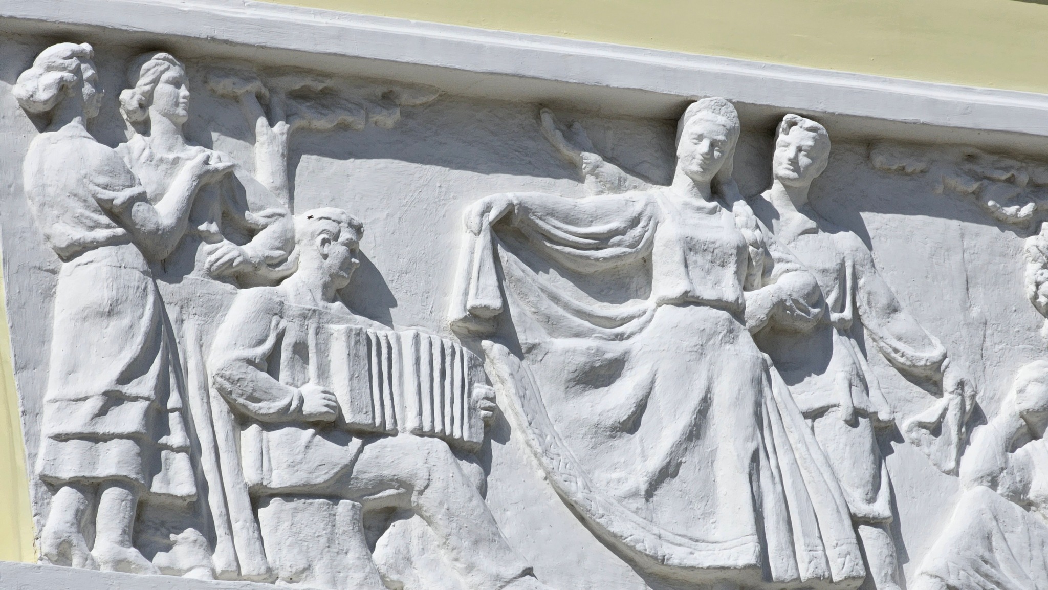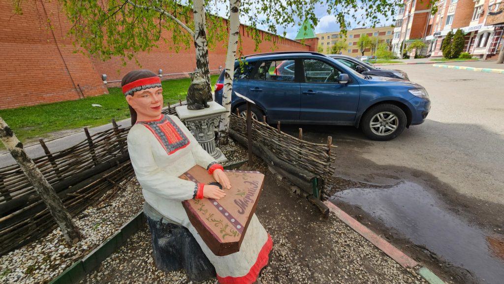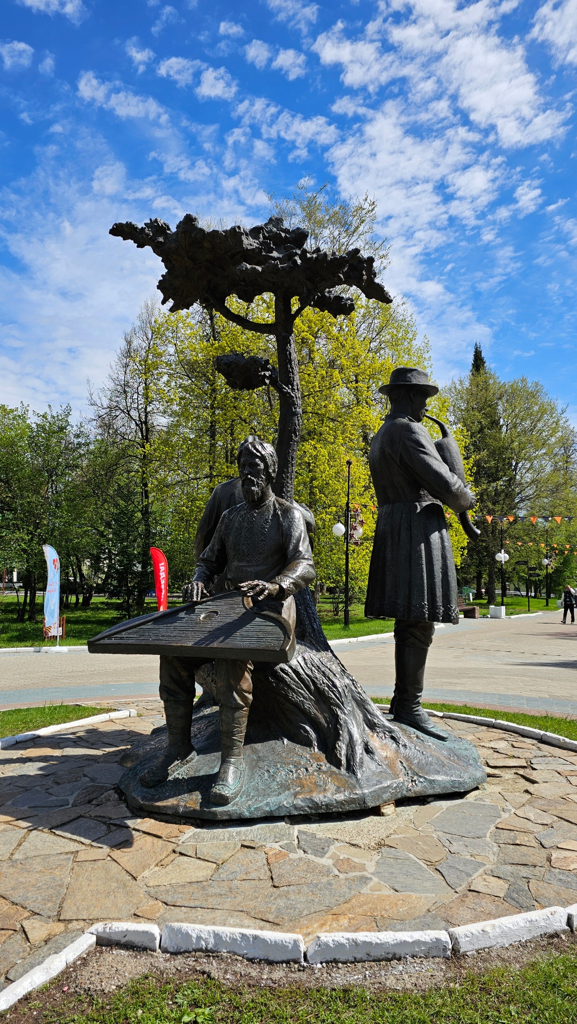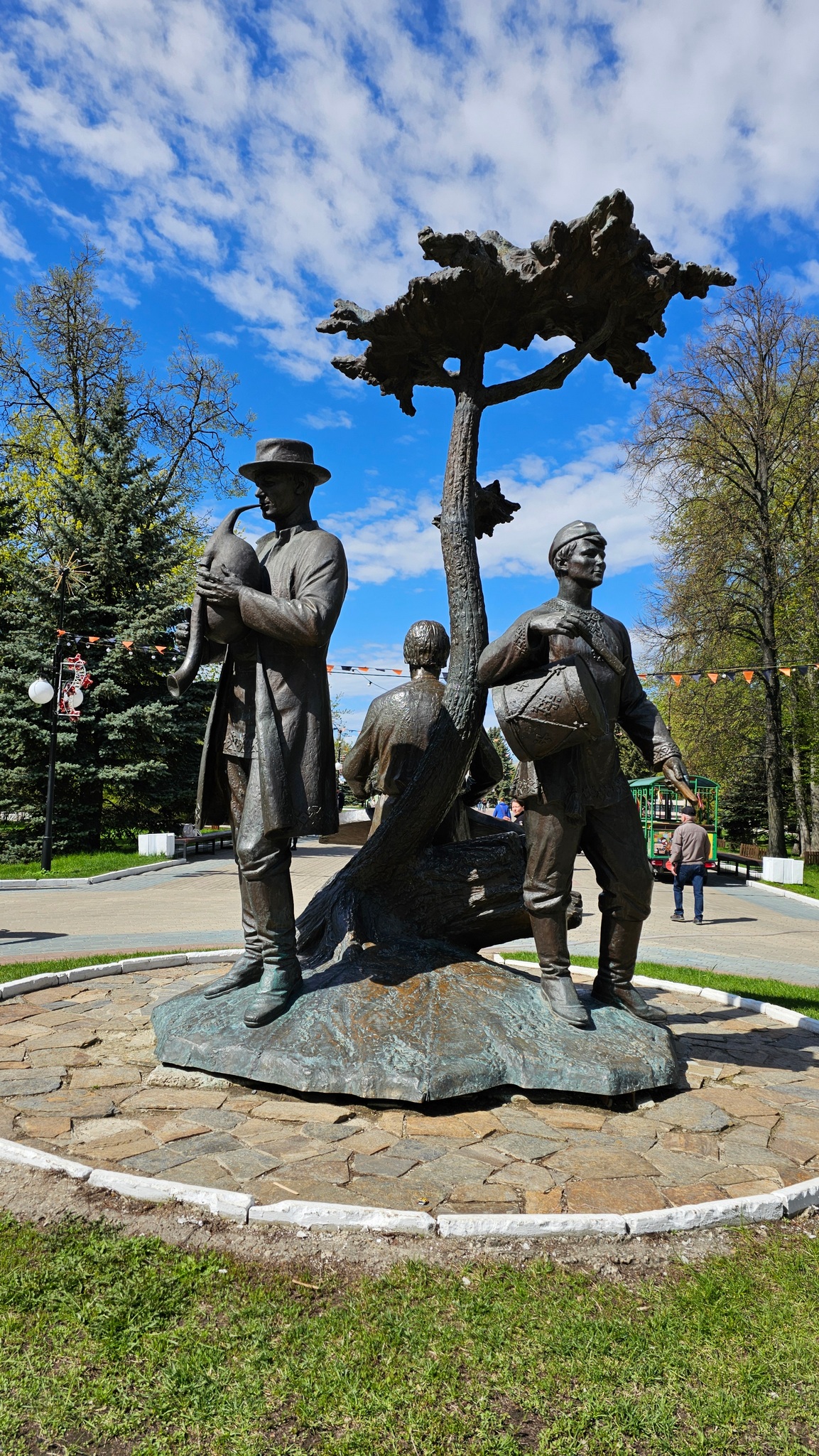 В его состав входят три фигуры людей с музыкальными инструментами в национальных костюмах: молодой человек с барабаном, мужчина постарше со свирелью и старец с марийскими гуслями.