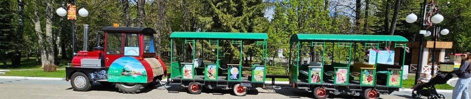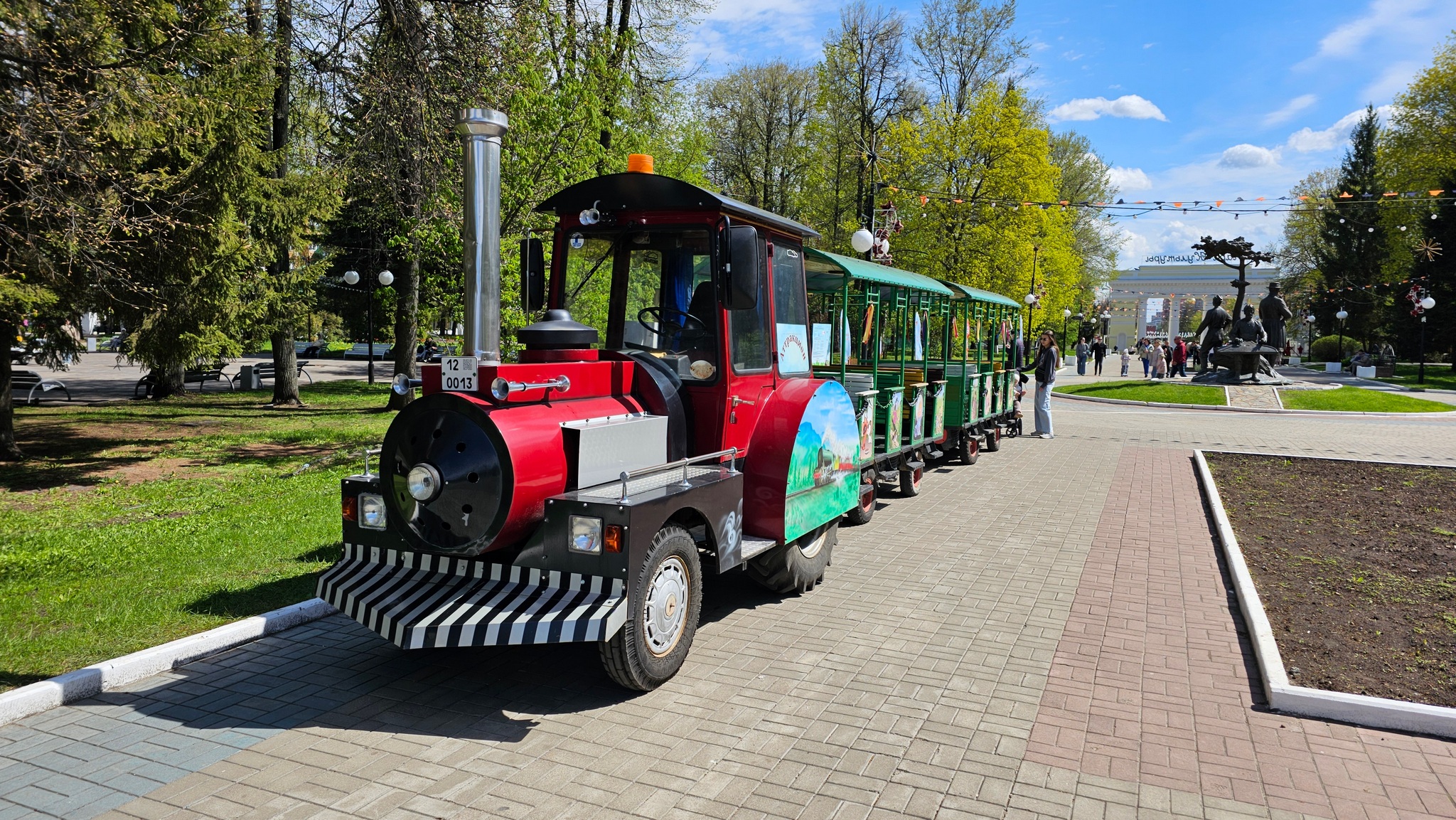 По парку ездит веселый паровозик с вагонами. Детям здорово прокатиться.