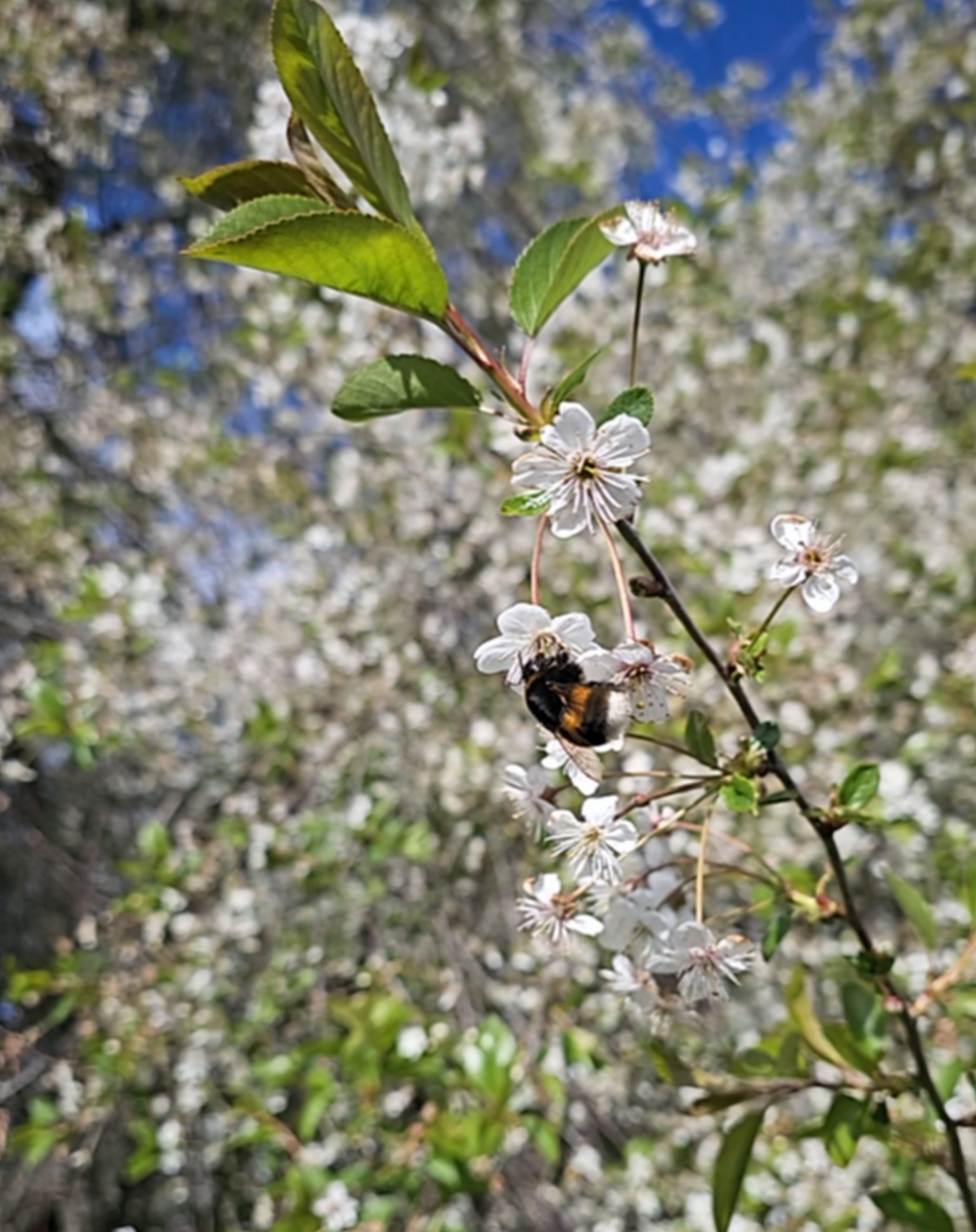 Май в разгаре. Цветущее дерево пользуется успехои у шмелей. На одном дереве десятки насекомых — перелетают с цветка на цветок.