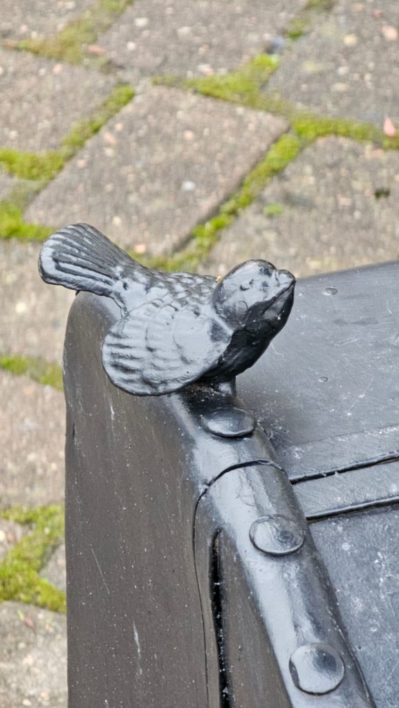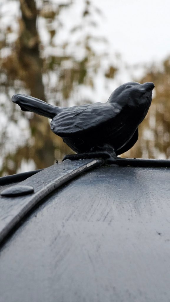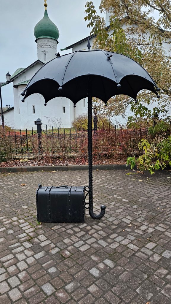 Рядом с церковью, на территории отеля жанровая скульптура «Зонт и чемодан».