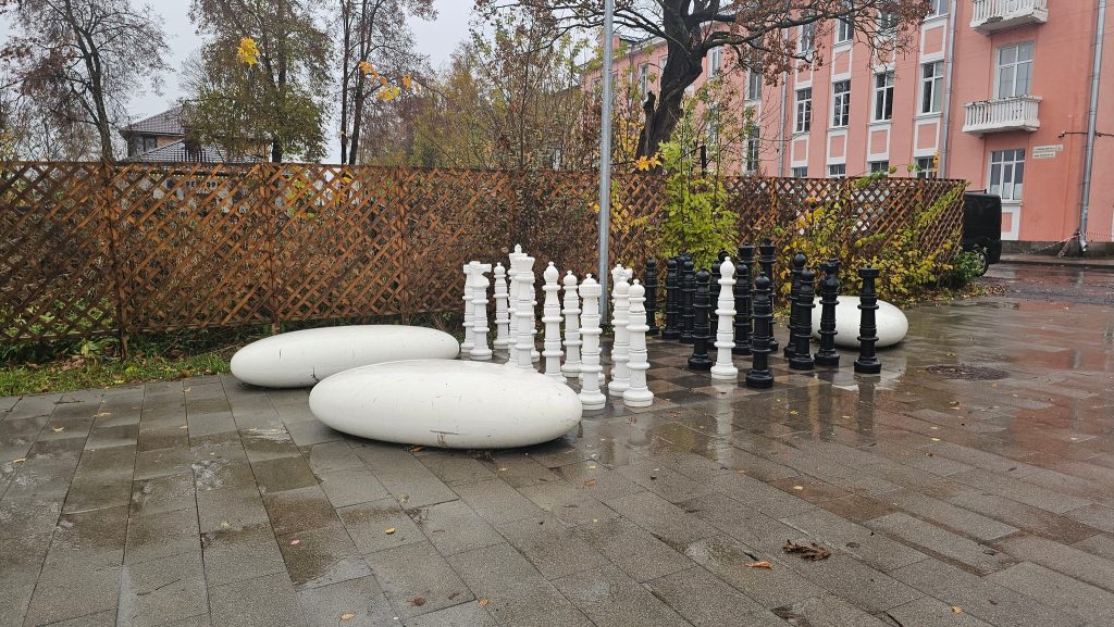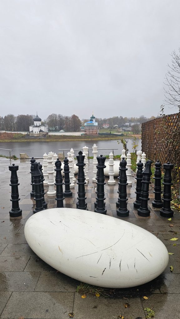 Далее — на набережную реки Великой. Здесь на смотровой площадки с видом на Мирожский монастырь — гигантские шахматы и гигантская же галька.