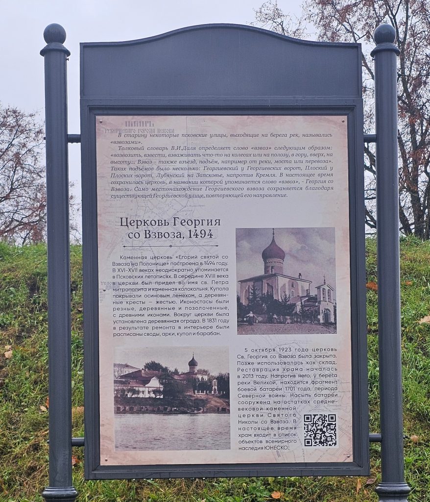 Псковские летописи сообщают о построении каменной церкви » … на сузвози святого георгия..». Упоминается церковь в связи с большим пожаром в Пскове и под 1539 годом. В XVI и XVII вв. церковь упоминается во многих источниках как «Егорий святой со взвоза на полонище». (http://pleskov60.ru/cerkov-georgiya-s-vzvoza.html)