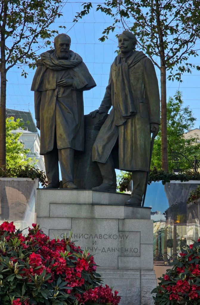 Памятник основателям МХТ им. А. П. Чехова К. С. Станиславскому и Вл. И. Немировичу-Данченко установлен на пересечении Тверской улицы и Камергерского переулка.