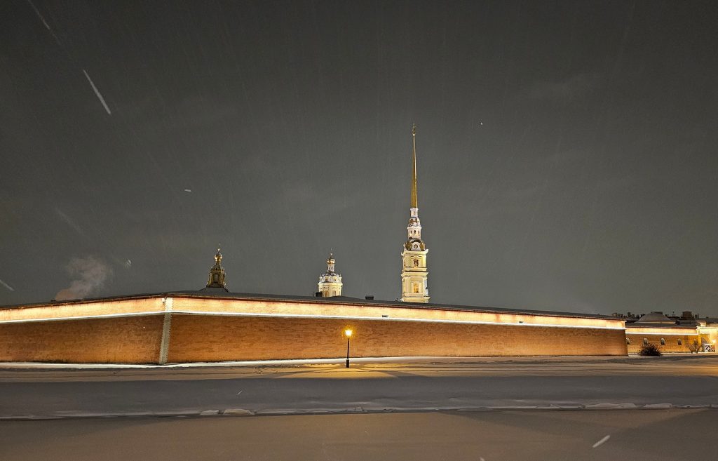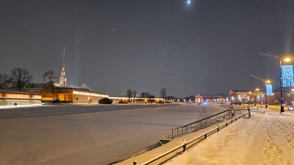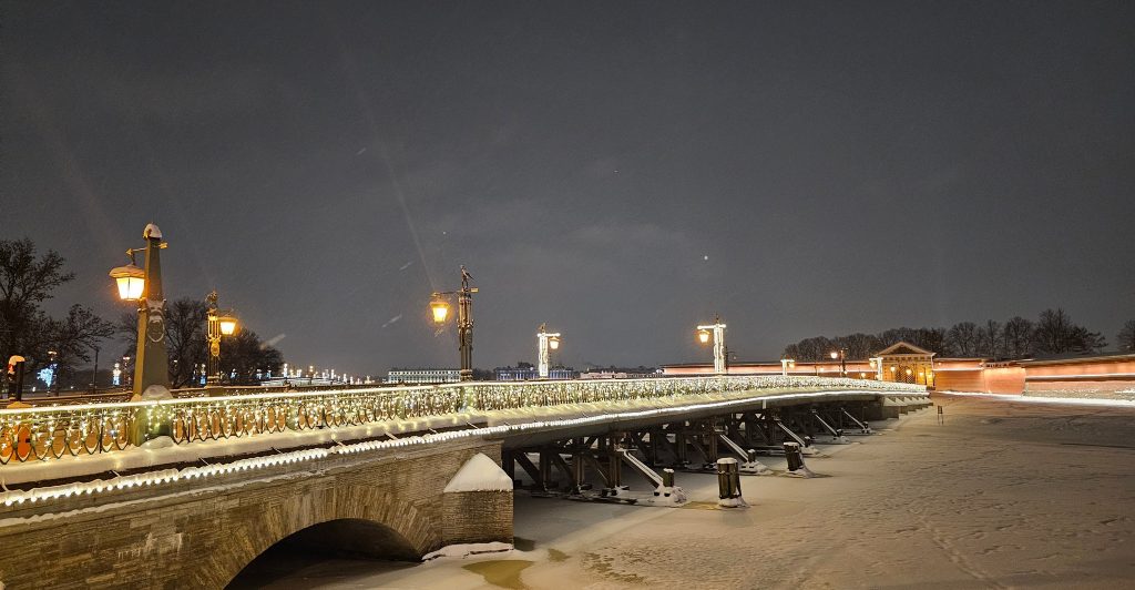 Пройдем по традиционному маршруту — от метро Горьковская, у Петропавловской крепости, по Биржевому мосту на Стрелку Васильевского рстрова, по Дворцовому мосту, на Дворцовую площадь и далее по Невскому проспекту до метро.