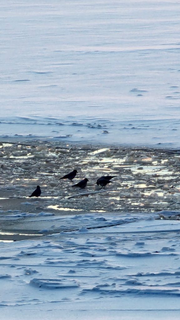 Вороны что-то ищут среди льда и воды.
